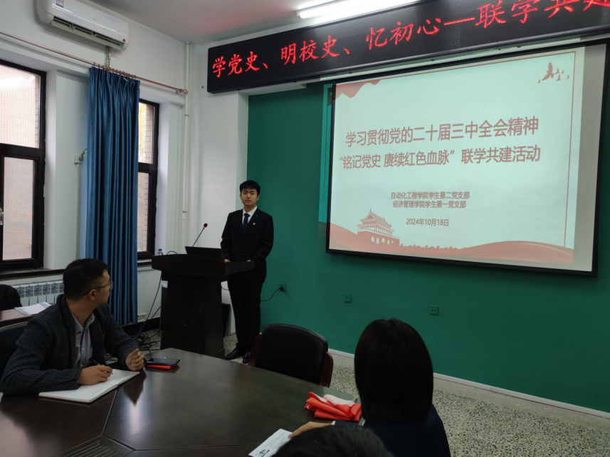 为深入学习习近平新时代中国特色社会主义思想和党的二十届三中全会精神,进一步全面深化改革新思想,引领学生党员用党的创新理论统一思想、统一意志、统一行动,铸牢听党话、跟党走的立身之本和政治之魂,切实激发学生党员的爱校荣校之情、感恩奉献之心和报国成才之志。10月18日,AG电子 学生第二党支部、经济管理AG电子 学生第一党支部于三教D202联合开展“学党史、明校史、忆初心”联学联建活动,本次活动由经济管理AG电子 学生第一党支部书记张德义主持。